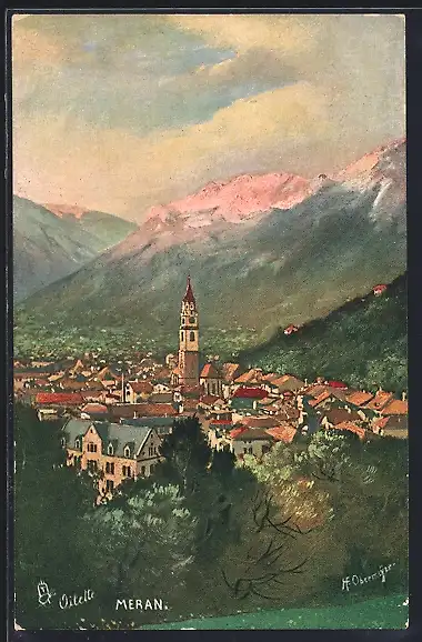 Künstler-AK Meran, Ortsansicht in den Bergen