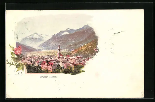 Künstler-AK Meran, Ortspartie aus der Vogelschau