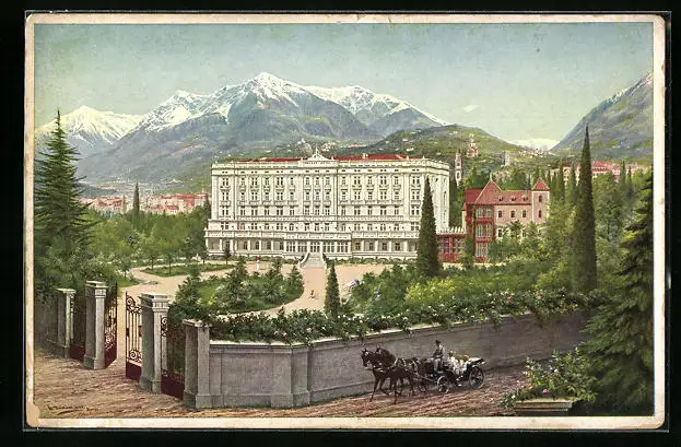 Künstler-AK Meran, Palast-Hotel mit Pferdewagen