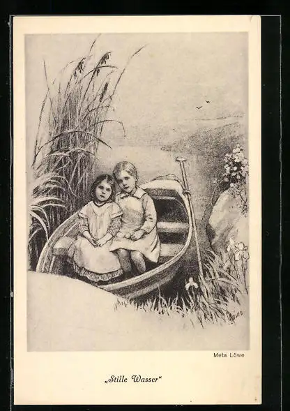 Künstler-AK Meta Löwe: Stille Wasser, Zwei Kinder im Boot