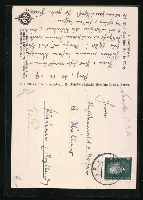 Personenbezogene Daten auf der Rückseite der Karte wurden durch blauen Textmarker unkenntlich gemacht. Die blauen Stellen sind auf die Vorderseite durchgeweicht und wirken sich negativ auf das Postkartenfoto aus