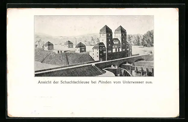 Künstler-AK Minden i. W., Ansicht der Schachtschleuse vom Unterwasser aus
