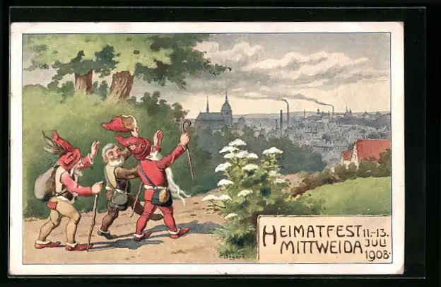 Künstler-AK Mittweida, Heimatfest 1908, Teilansicht mit Zwergen
