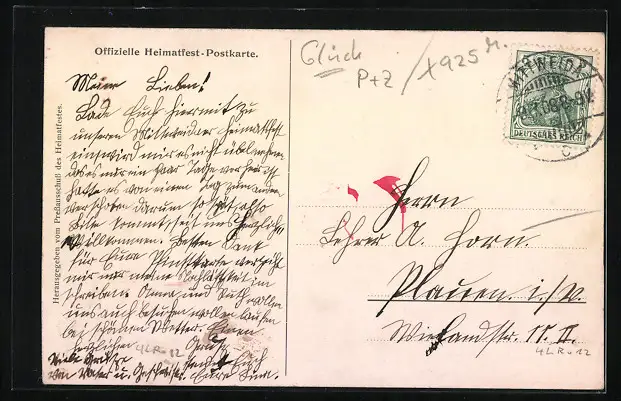 Personenbezogene Daten auf der Rückseite der Karte wurden durch blauen Textmarker unkenntlich gemacht. Die blauen Stellen sind auf die Vorderseite durchgeweicht und wirken sich negativ auf das Postkartenfoto aus