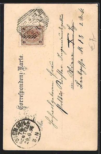 alte Ansichtskarte, gelaufen 1898, Eckknicke li. unten und re. oben, Bugspur unten mittig, Klebereste mittig, guter Zustand
