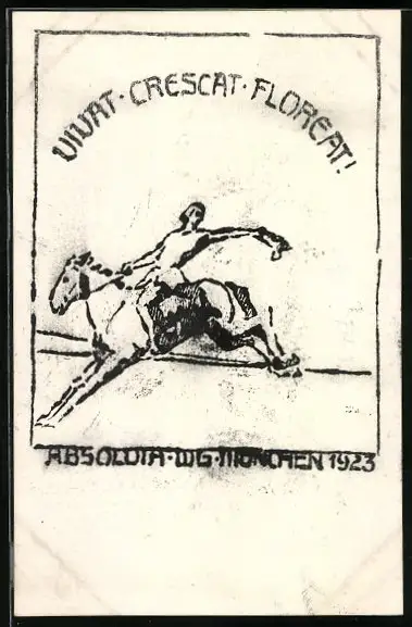 Künstler-AK München, Absolvia 1923, Pferd und Reiter setzen über ein Hindernis