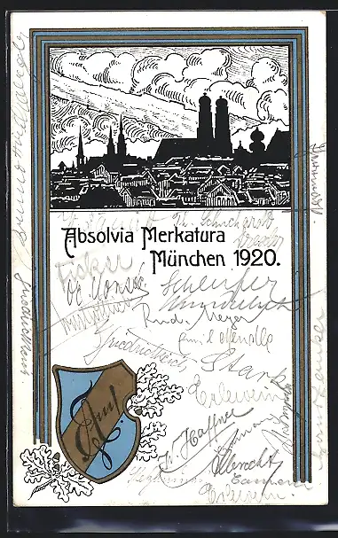 Künstler-AK München, Absolvia Merkatura 1920, Studentenwappen, Ortsansicht