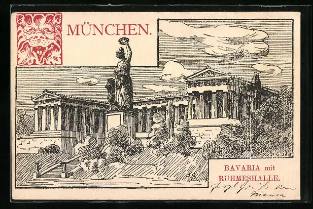 Künstler-AK München, Bavaria mit Ruhmeshalle