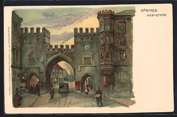 Künstler-AK München, Karlsthor im Abendlicht, Strassenbahn