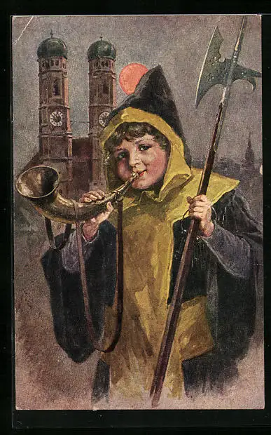 Künstler-AK München, Münchner Kindl mit Horn und Axt, Im Hintergrund Frauenkirche