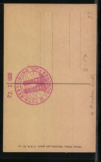 Personenbezogene Daten auf der Rückseite der Karte wurden durch blauen Textmarker unkenntlich gemacht. Die blauen Stellen sind auf die Vorderseite durchgeweicht und wirken sich negativ auf das Postkartenfoto aus
