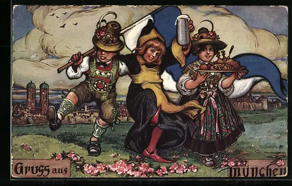 Künstler-AK München, Münchner Kindl zwischen Mann und Frau in Tracht