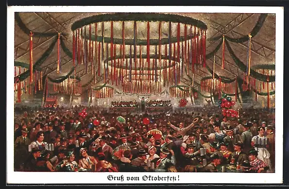 Künstler-AK München, Oktoberfest, Feiernde im Festsaal
