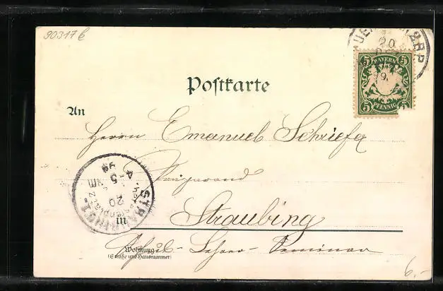 Personenbezogene Daten auf der Rückseite der Karte wurden durch blauen Textmarker unkenntlich gemacht. Die blauen Stellen sind auf die Vorderseite durchgeweicht und wirken sich negativ auf das Postkartenfoto aus
