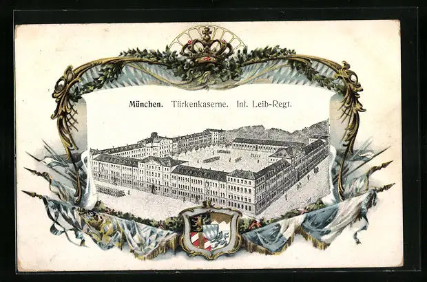 Künstler-AK München, Türkenkaserne, Inf. Leib-Regt. mit Wappen