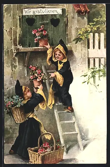 Künstler-AK Münchner Kindl gratulieren mit Blumen
