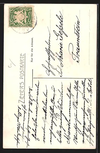 Personenbezogene Daten auf der Rückseite der Karte wurden durch blauen Textmarker unkenntlich gemacht. Die blauen Stellen sind auf die Vorderseite durchgeweicht und wirken sich negativ auf das Postkartenfoto aus