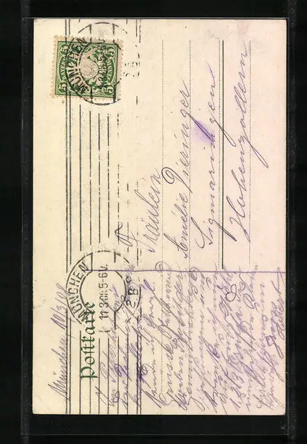 Personenbezogene Daten auf der Rückseite der Karte wurden durch blauen Textmarker unkenntlich gemacht. Die blauen Stellen sind auf die Vorderseite durchgeweicht und wirken sich negativ auf das Postkartenfoto aus