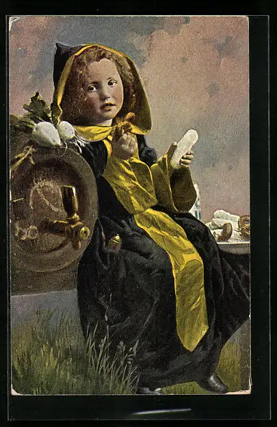 Künstler-AK Münchner Kindl mit Weisswurst und Breze