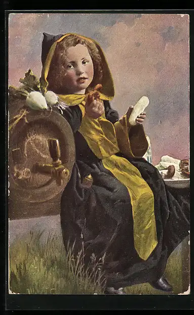 Künstler-AK Münchner Kindl mit Weisswurst und Breze