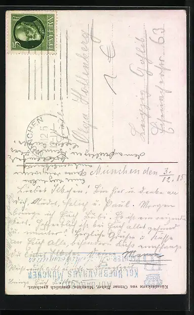 Personenbezogene Daten auf der Rückseite der Karte wurden durch blauen Textmarker unkenntlich gemacht. Die blauen Stellen sind auf die Vorderseite durchgeweicht und wirken sich negativ auf das Postkartenfoto aus