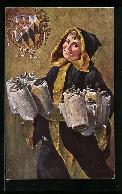 Künstler-AK Münchner Kindl trägt Masskrüge, Wappen