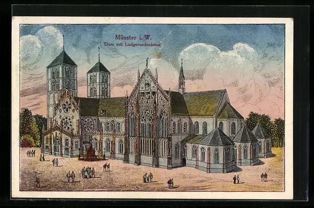 Künstler-AK Münster i. W., Dom mit Ludgerusdenkmal