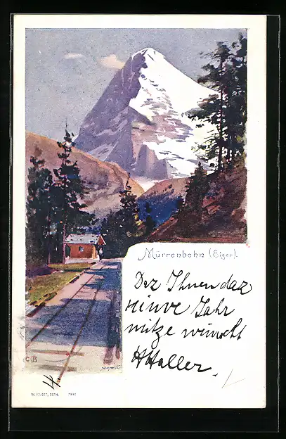 Künstler-AK Mürrenbahn, Bahnstation unter dem Eiger