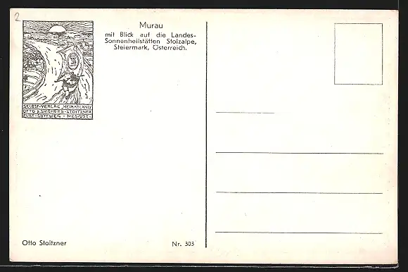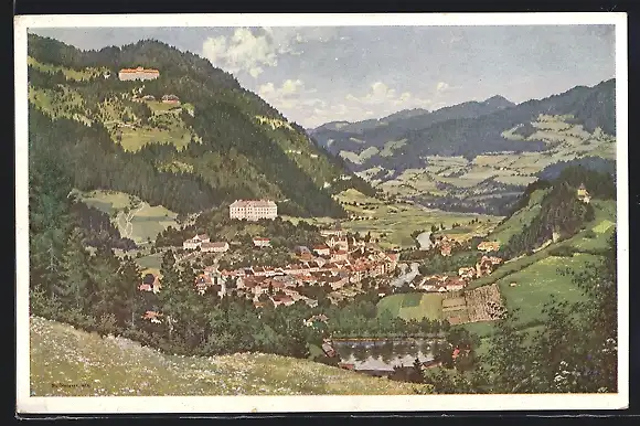 Künstler-AK Murau, Totale mit Landessonnenheilstätten Stolzalpe