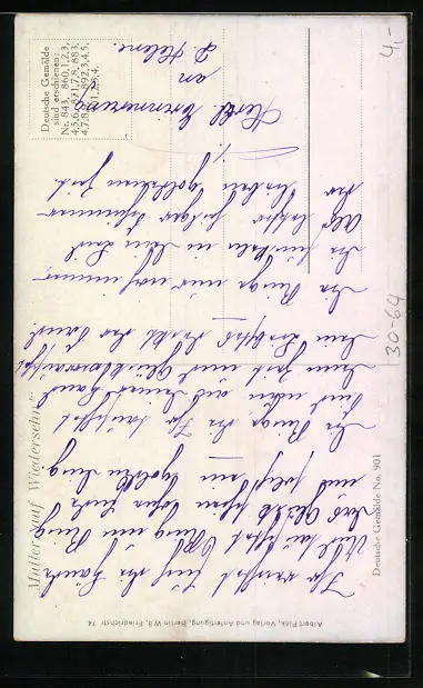 Personenbezogene Daten auf der Rückseite der Karte wurden durch blauen Textmarker unkenntlich gemacht. Die blauen Stellen sind auf die Vorderseite durchgeweicht und wirken sich negativ auf das Postkartenfoto aus