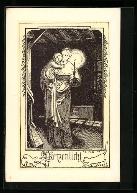 Künstler-AK Mutter mit ihrem Kind auf den Arm und Kerzenlicht in der Hand
