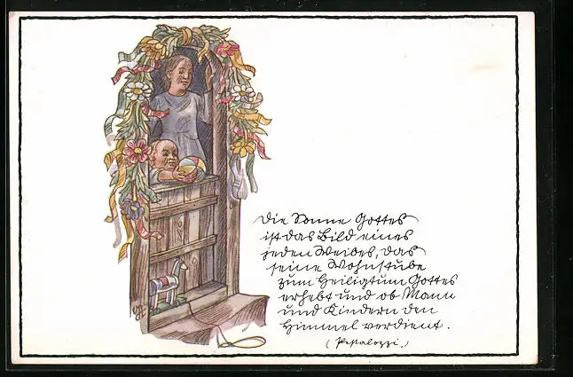 Künstler-AK Mutter und Kind an geschmückter Pforte