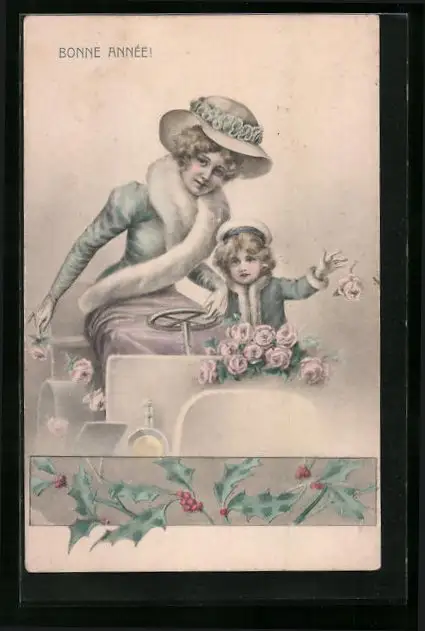 Künstler-AK Mutter und Kind im Auto