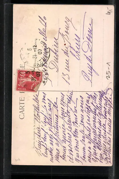 Personenbezogene Daten auf der Rückseite der Karte wurden durch blauen Textmarker unkenntlich gemacht. Die blauen Stellen sind auf die Vorderseite durchgeweicht und wirken sich negativ auf das Postkartenfoto aus