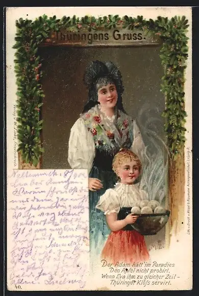 Künstler-AK Mutter und Tochter in thüringischen Trachten mit Klösen