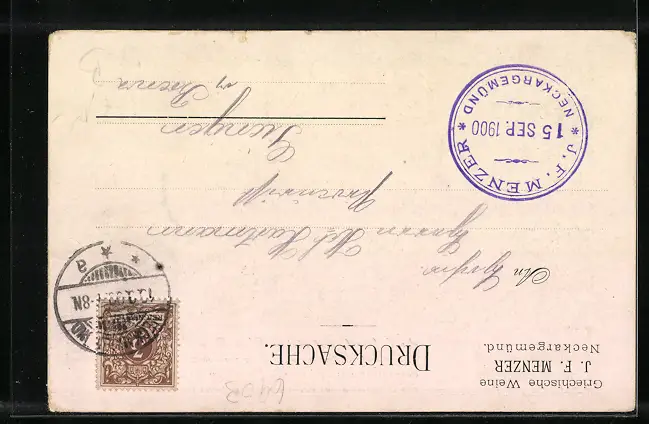 Personenbezogene Daten auf der Rückseite der Karte wurden durch blauen Textmarker unkenntlich gemacht. Die blauen Stellen sind auf die Vorderseite durchgeweicht und wirken sich negativ auf das Postkartenfoto aus