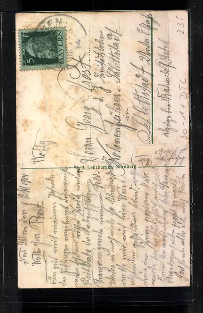 Personenbezogene Daten auf der Rückseite der Karte wurden durch blauen Textmarker unkenntlich gemacht. Die blauen Stellen sind auf die Vorderseite durchgeweicht und wirken sich negativ auf das Postkartenfoto aus