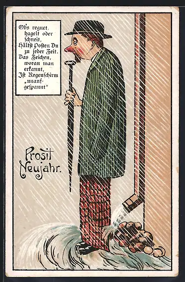 Künstler-AK Neujahrsgruss, Mann mit Schirm steht im Regen, Scherz