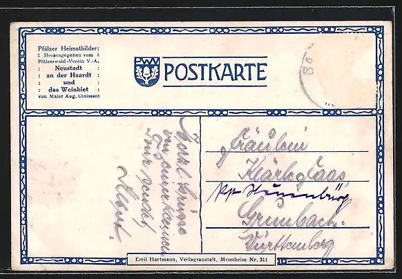 Personenbezogene Daten auf der Rückseite der Karte wurden durch blauen Textmarker unkenntlich gemacht. Die blauen Stellen sind auf die Vorderseite durchgeweicht und wirken sich negativ auf das Postkartenfoto aus