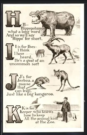 Künstler-AK Nilpferd, Antilope, Tierpfleger, Gedicht