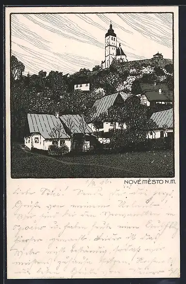 Künstler-AK Nové Mesto n. M., Teilansicht mit Kirche