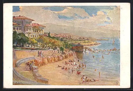 Künstler-AK Novi Vinodolski, Ortsansicht, belebter Strand an der Adria