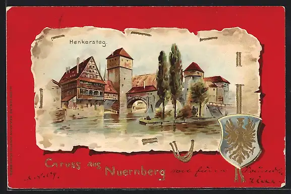 Künstler-AK Nürnberg, Henkersteg mit Wappen