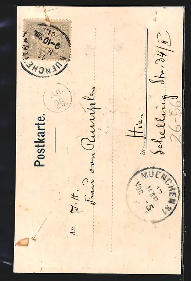 Personenbezogene Daten auf der Rückseite der Karte wurden durch blauen Textmarker unkenntlich gemacht. Die blauen Stellen sind auf die Vorderseite durchgeweicht und wirken sich negativ auf das Postkartenfoto aus