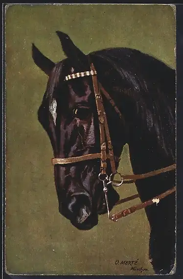 Künstler-AK O. Merte: schwarzes Pferd mit Zaumzeug