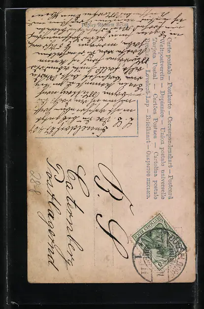 Personenbezogene Daten auf der Rückseite der Karte wurden durch blauen Textmarker unkenntlich gemacht. Die blauen Stellen sind auf die Vorderseite durchgeweicht und wirken sich negativ auf das Postkartenfoto aus