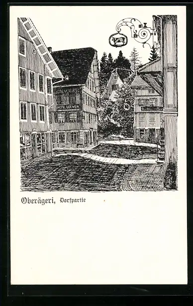 Künstler-AK Oberägeri, Strassenpartie mit Hotel Loewen