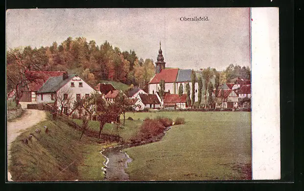 Künstler-AK Oberailsfeld, Ortspartie mit Kirche und Bach