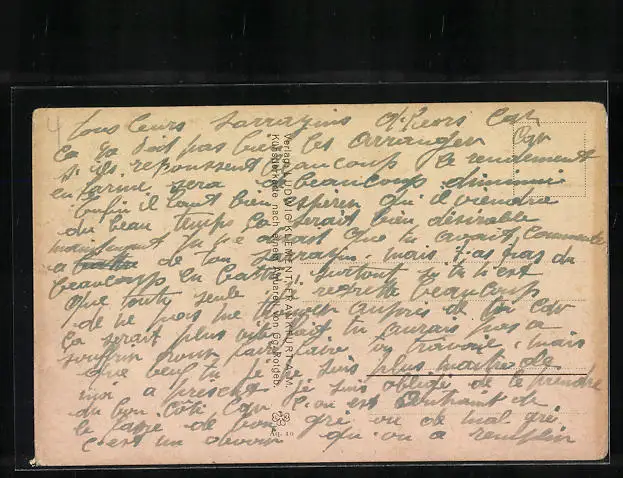 Personenbezogene Daten auf der Rückseite der Karte wurden durch blauen Textmarker unkenntlich gemacht. Die blauen Stellen sind auf die Vorderseite durchgeweicht und wirken sich negativ auf das Postkartenfoto aus