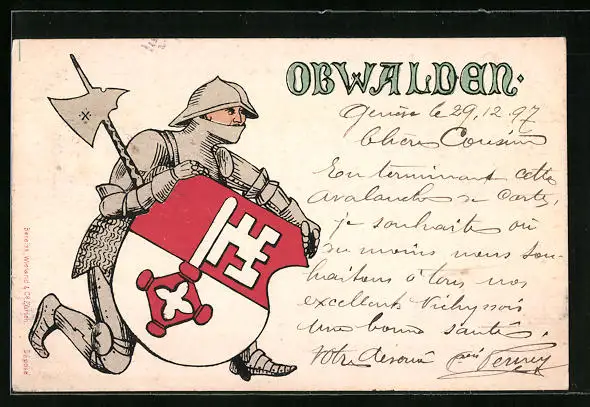 Künstler-AK Obwalden, Ritter mit Axt und Wappen